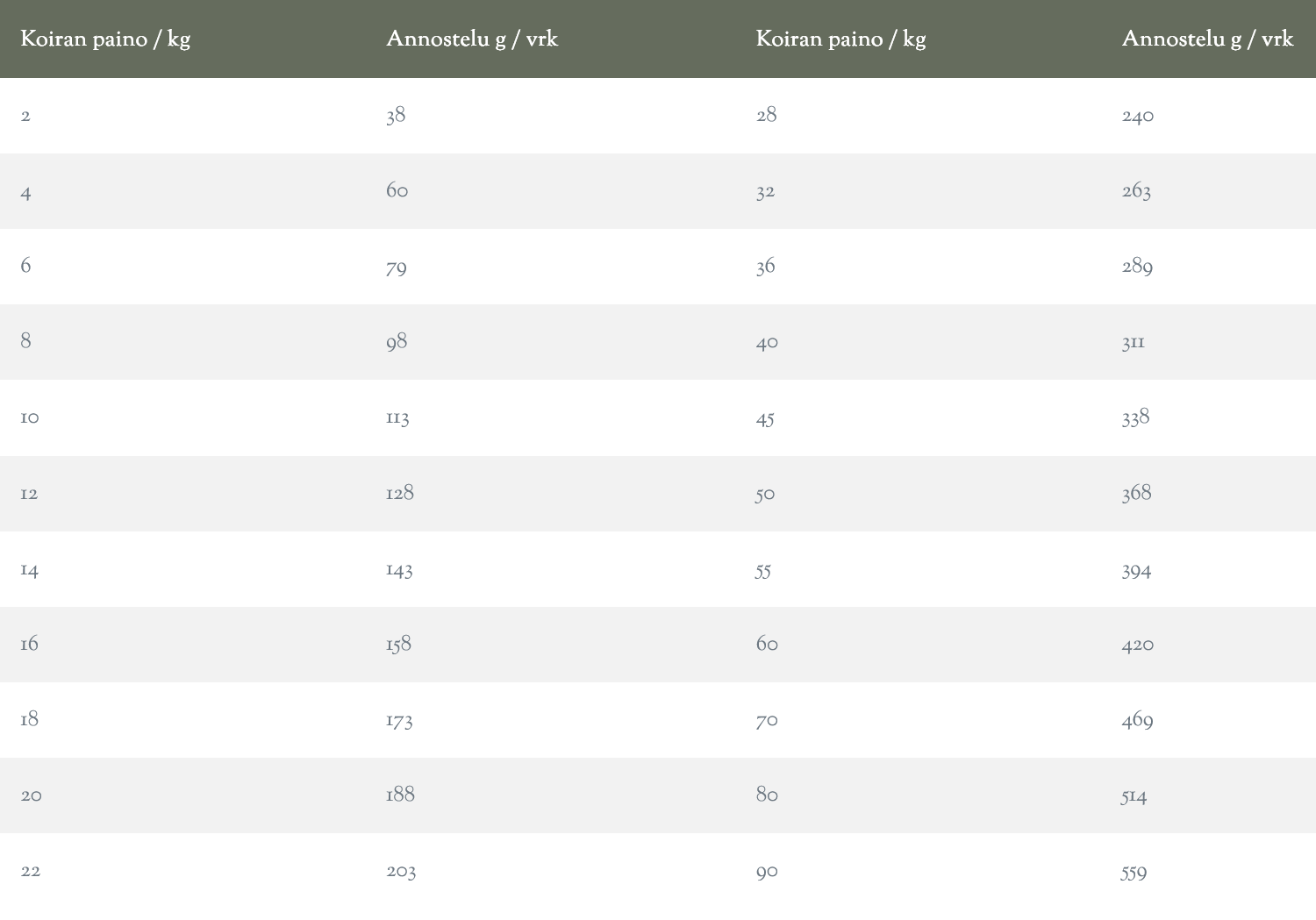 Ravintosisältö: Valkuainen 30 %, rasva 20 %, kuitu 4 %, tuhka 10 %, kosteus 8 %.