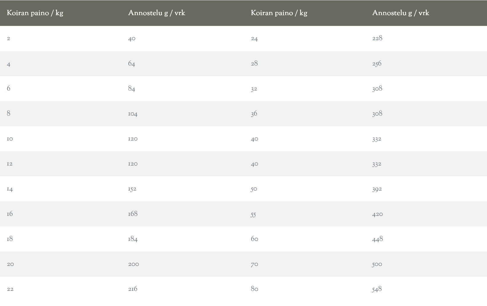 Koostumus: Lohijauho (>26%), kaurapuuro, valkoinen täysjyväriisi, tumma täysjyväriisi, lohenrasva (säilötty vitamiinein), juurikasjauho, kokojyvä pellavansiemen, porkkana, kananmuna (>3%), herne, alfalfa, kananmaksakastike, suola (natrox), merilevä, yucca, omena, glukosamiini, kondroitiini, karpalo, seleeni, betakarotiini, L-karnitiini, inuliini, beetaglukaani, FOS (>550 mg/kg), MOS (>550 mg/kg), maitohappobakteerit maitohappobakteerit Bacillus Acidophilus (DSM 13241) ja Enterococcus Faecium (DSM 10663), (1*10^9 CFU/g), vitamiinit ja hivenaineet.