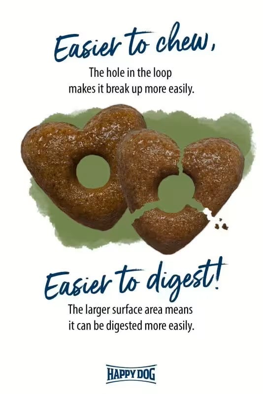 Resepti perustuu hyvin siedettyyn lampaanlihaan ja helposti sulavaan riisiin, eikä sisällä siipikarjaa, gluteenia tai perunaa. Uuden-Seelannin viherhuulisimpukka tukee nivelten kehitystä ja huolellisesti valitut yrtit edistävät ruoansulatusta ja yleistä hyvinvointia. Sydämenmuotoinen, reiällinen nappula hajoaa helposti pureskeltaessa, mikä parantaa sulavuutta ja tekee ruokailusta miellyttävää myös herkille nuorille koirille.