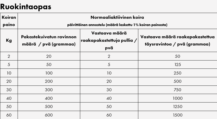 100 g tuotetta vastaa noin 300 g pakastettua raakaruokaa.