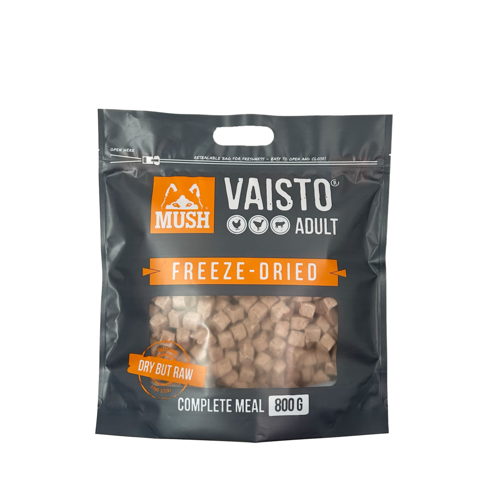 Mush Vaisto Harmaa Freeze-Dried on huippulaadukas, kotimainen täysravinto aikuisille koirille. Tuote sisältää 95 % lihaa, luita ja sisäelimiä kolmesta eri eläimestä – kanasta, kalkkunasta ja lampaasta – tarjoten laajan kirjon aminohappoja ja ravinteita koirasi hyvinvointiin. Mukana myös kasvikset, marjat ja öljyt tukemassa ruoansulatusta, vastustuskykyä ja turkin kiiltoa.